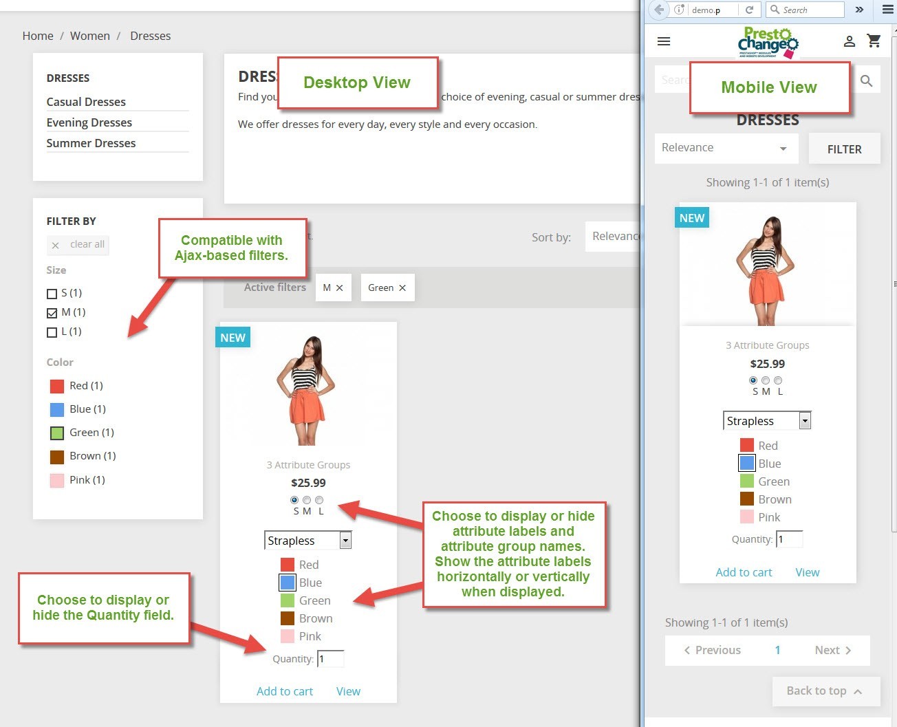 See below for additional destails, demo links, reviews and more.Display attribute drop down menus, radio buttons or images and a quantity box on the product list page, allowing the customer to add a product to the cart directly from that page (without having to enter the product page or load a quick shop popup).