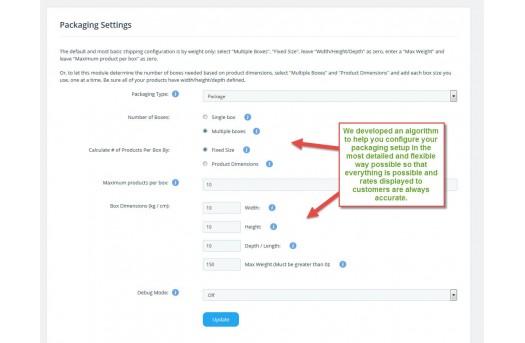 Multiple Boxes (Product Dimensions) - Define all the box sizes you use for shipping, assign dimensions to your products, and the module will automatically calculate (using an algorithm we developed) how many boxes are needed to fit all the products (always trying to use the smallest / lowest number of packages).